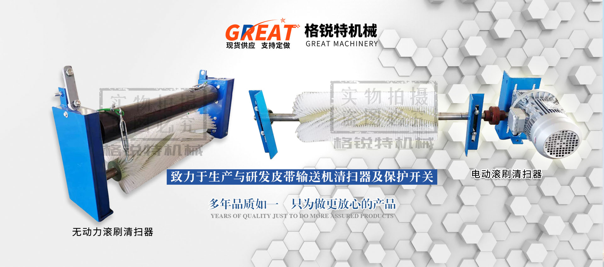 衡水格銳特機械科技有限公司常年致力于生產與研發(fā)皮帶輸送機清掃器及保護開關,其中主營聚氨酯清掃器,合金清掃器,電動滾刷清掃器,機械式滾刷清掃器,緩沖床,緩沖條,雙向拉繩開關,兩級跑偏開關,打滑檢測器,料流檢測器等保護開關,常年銷往各大水泥廠,煤礦廠,電廠,輸送機廠家,質量優(yōu)越,價格實惠,望各大領導及同行來廠參觀指導,期待您的光臨!!!